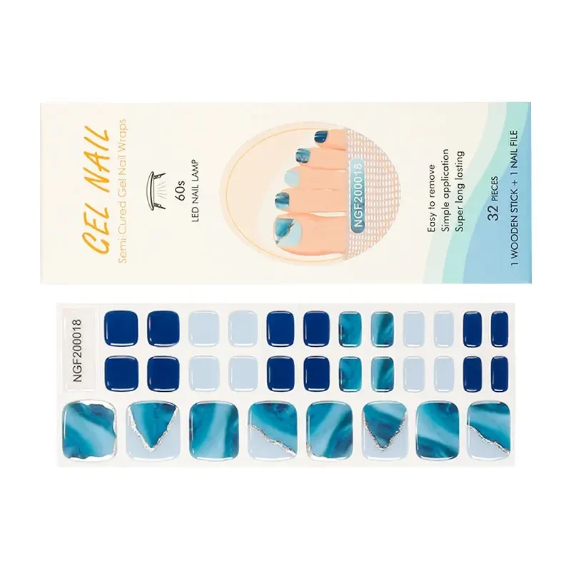 Breng de schoonheid van de oceaan naar je teennagels met de Glitter Bleu Ocean Teen Wraps. Deze wraps combineren verschillende tinten blauw, van lichtblauw tot donkerblauw, met een marmeren effect en gouden details voor een luxe, verfijnde uitstraling. Het glittereffect voegt een extra sprankeling toe, perfect voor een chique en moderne look.