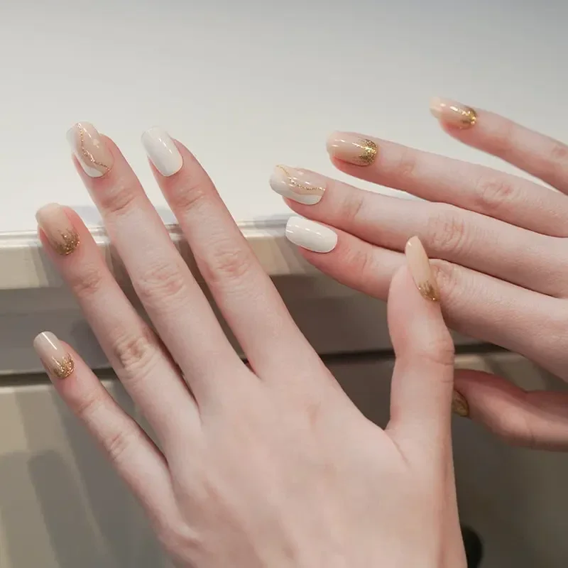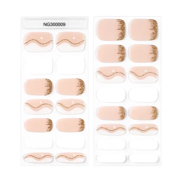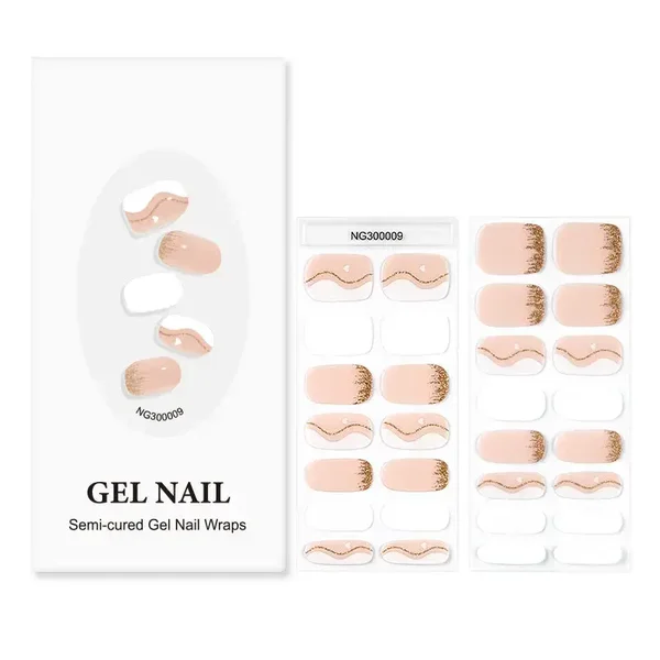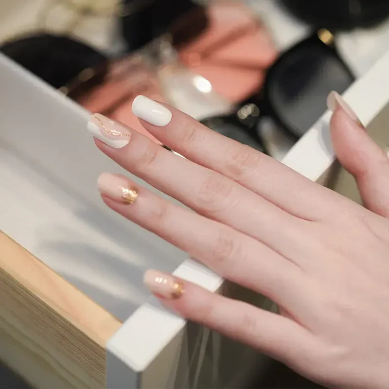 Deze set combineert het beste van alles: nagels in een zachte mix van wit en roze, speelse swirls en verfijnde gouden accenten. Een aantal nagels zijn effen, zodat je eindeloos kunt variëren.
