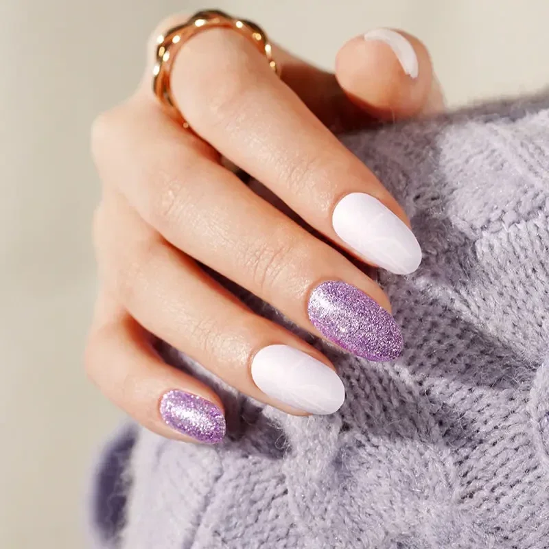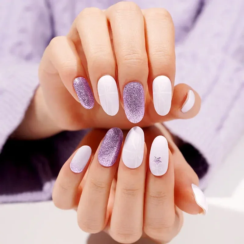 Lila nagels met een magische touch: sommige met een glitterster, anderen volledig glitter of een subtiele glitter dip. Een speelse mix van zacht en sprankelend – perfect voor wie houdt van een beetje shine met stijl. Elegant met een tikje magie.